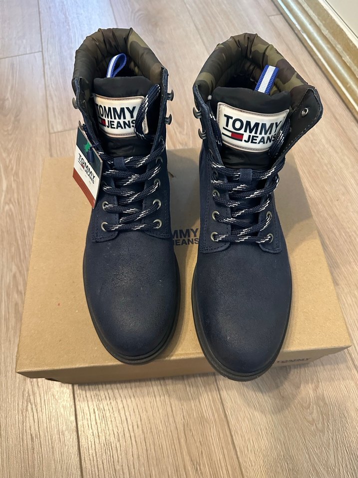 Tommy marka, Sıfır etiketli bot, Mavi süet deridir. Kullanılmamış, kutulu ve etiketlidir. 44 numara.