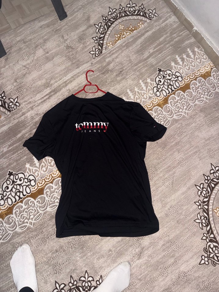 Tommy Jeans baskılı siyah, kısa kollu, bisiklet yaka, dar kesim erkek tişörtü, gündelik kullanım için uygun.