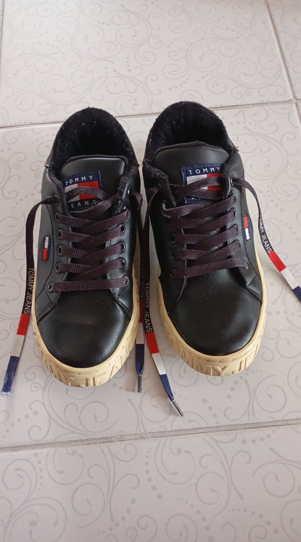 Tommy Jeans siyah erkek spor ayakkabı, koyu renk bağcıklar ve markalı uçlarla. Bej tabanlı, sokak stiline uygun tasarım. kalıbı dar olduğu için 34_35 numaraya uygun