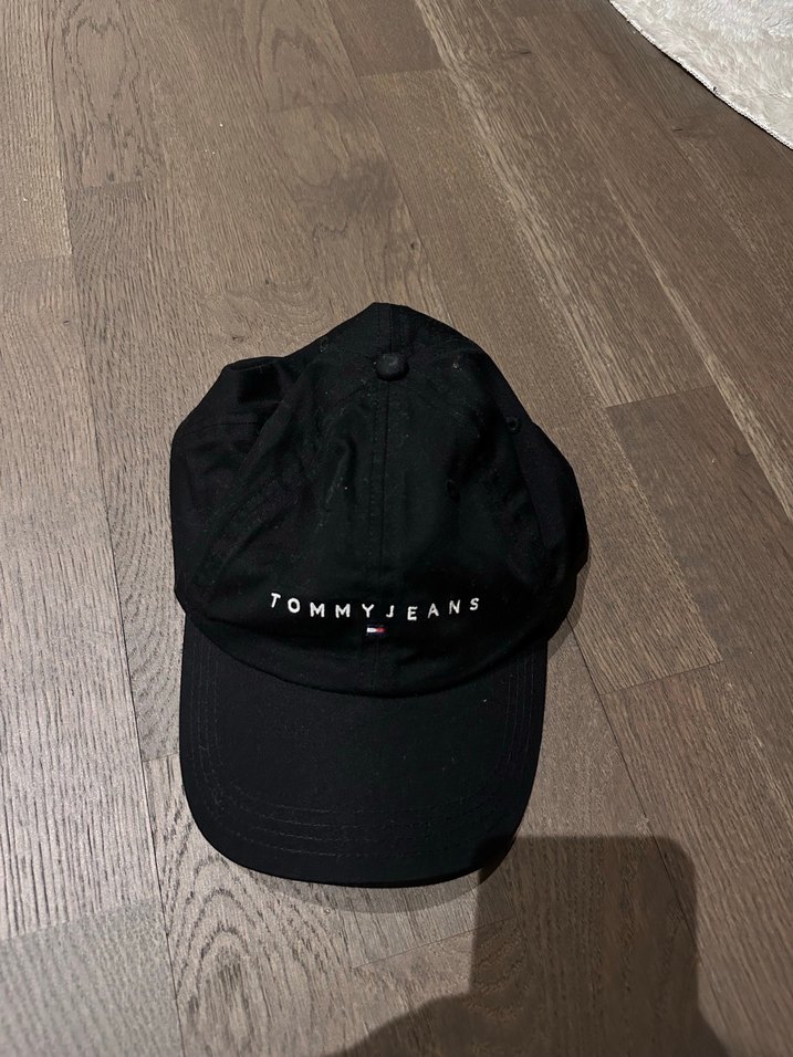 Siyah denim Tommy Jeans şapka, minimalist tasarım ve rahat şıklık sunar. Önünde "TOMMY JEANS" logosu yer alır.