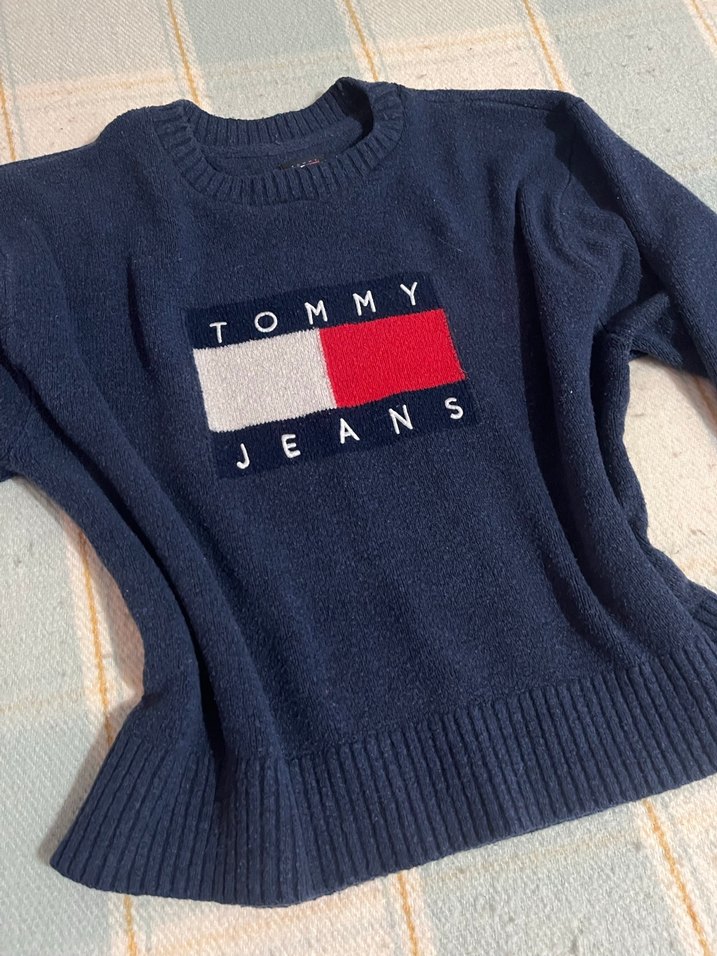 Tommy Jeans markalı, triko örme, uzun kollu, nakışlı, bisiklet yaka, mavi tonlarında, triko kazak.