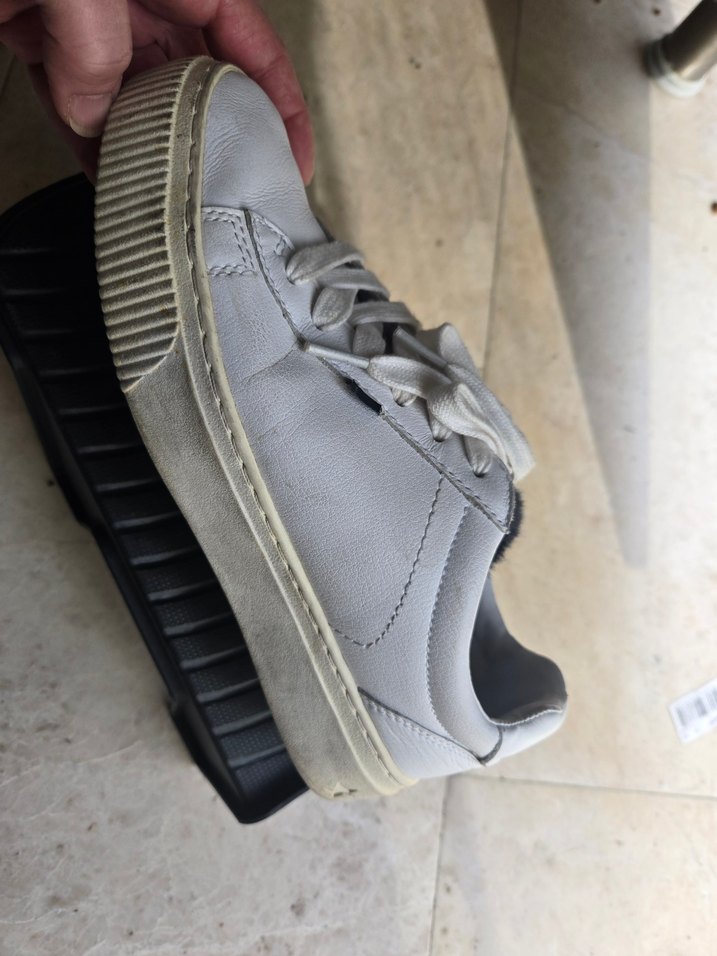 Kadınlar için beyaz, düz tabanlı spor ayakkabı. İç kısmında pastel tonlarda bağcıklı ve tüylü detaylar bulunur. Rahat sokak stili için uygundur.