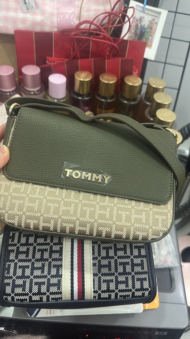 Tommy marka, baskılı haki ve gri deri detaylı, kemerli çapraz çanta. Sokak stili ve günlük kullanıma uygun.