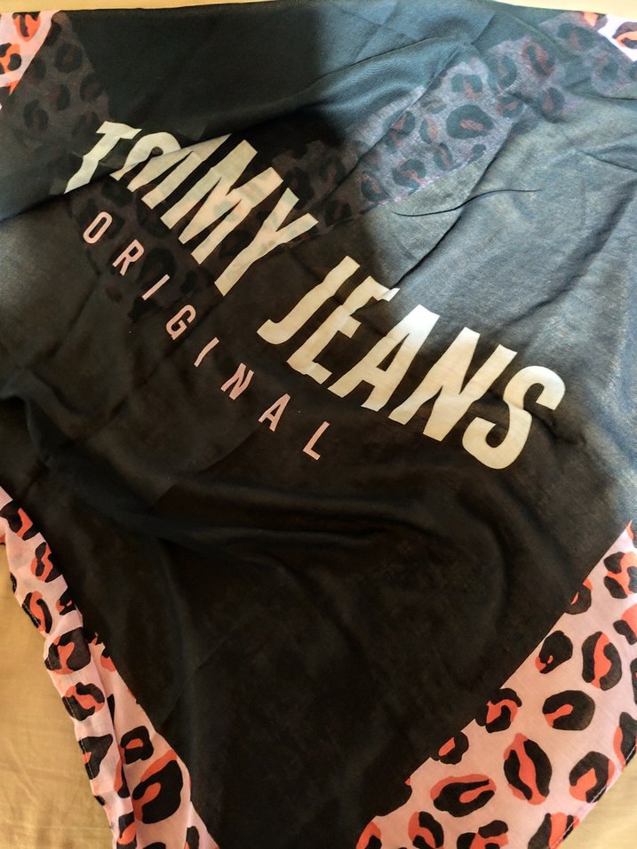 Koyu pembe renkte, leopar desenli kenarları ve 'THMYJEANS' logolu, grunge punk tarzı kadın fular. Sentetik kumaştan, salaş duruşlu.