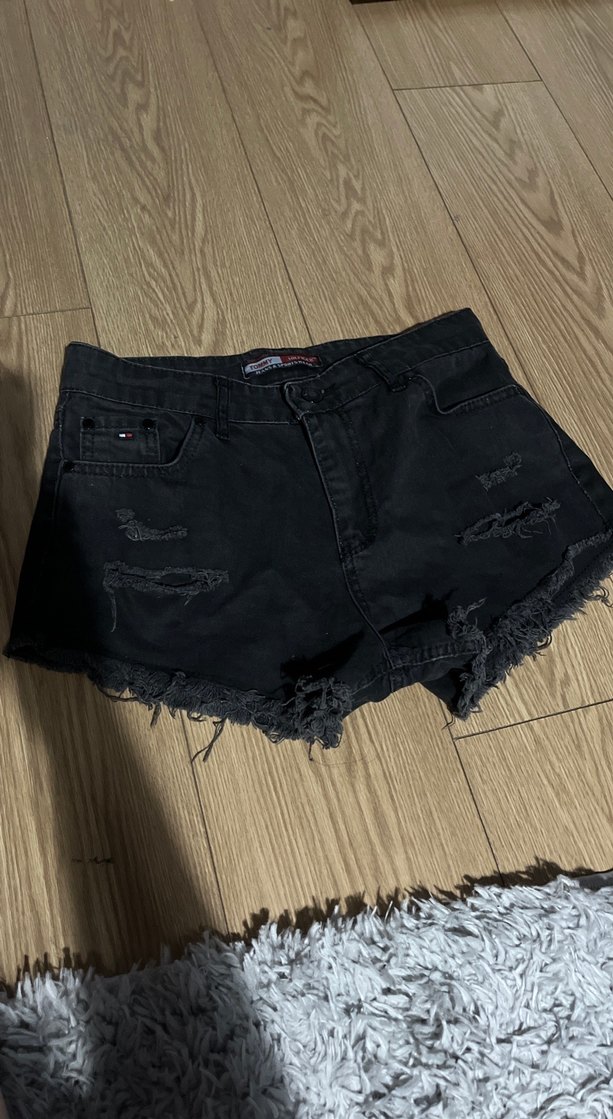 Siyah renkli, bol kesim yırtık detaylı denim mini şort. Püsküllü kenarlarıyla günlük sokak modasına uygun.