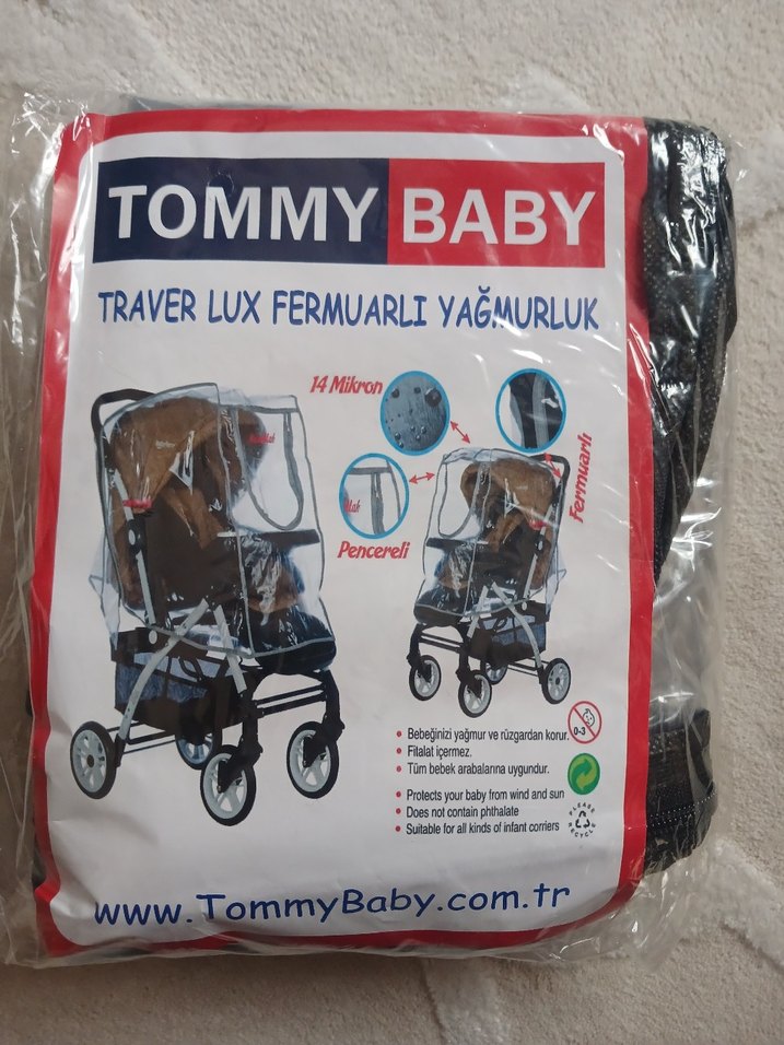 TommyBaby gri renk fermuarlı bebek arabası yağmurluğu, yağmur ve rüzgara karşı korur. Tüm bebek arabalarına uyumlu, pencere özellikli.