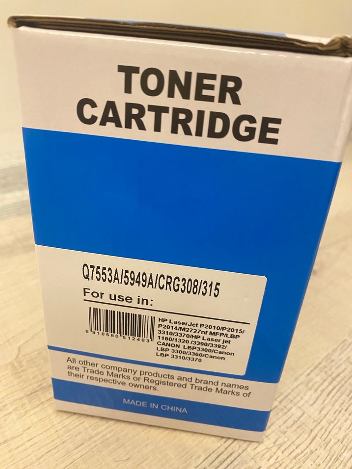 Çeşitli HP LaserJet ve Canon yazıcılarla uyumlu mavi toner kartuşu. Çin'de üretilmiştir. Model numaraları Q7553A, J5949A, CRG308 ve 315 içerir. ️