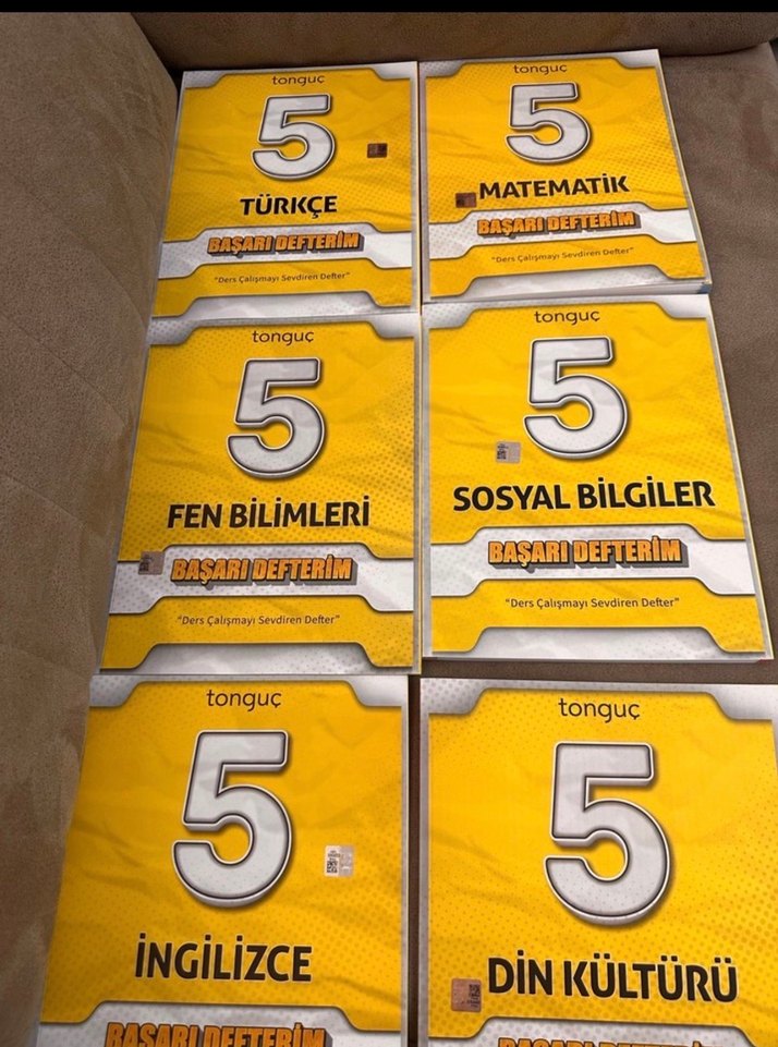 Tonguç 5. sınıf başarı defterleri Türkçe, Matematik, Fen Bilimleri, Sosyal Bilgiler, İngilizce ve Din Kültürü derslerini içerir. 6 sıfır set yeni basım