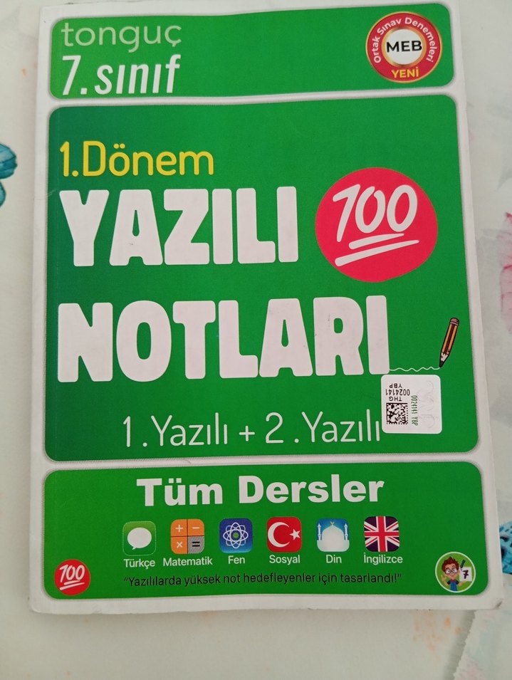 Tonguç 7. sınıf 1. dönem yazılı notları, Türkçe, Matematik, Fen, Sosyal, Din ve İngilizce derslerini içerir. Yazılılarda yüksek not hedefleyenler için hazırlanmıştır. tertemiz. karalama yok.