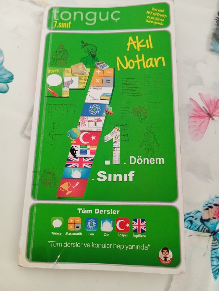 Tonguç 7. sınıf 1. dönem akıl notları, Türkçe, Matematik, Fen, Din, Sosyal ve İngilizce derslerini kapsar. Tüm dersler ve konular hep yanında. tertemiz. karalama yok.
