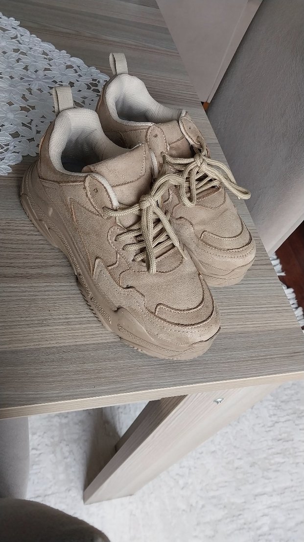 Düz tabanlı, bej süet kadın spor ayakkabısı. Günlük kullanıma uygun, desen içermeyen, athleisure ve streetwear tarzını yansıtan rahat bir model.