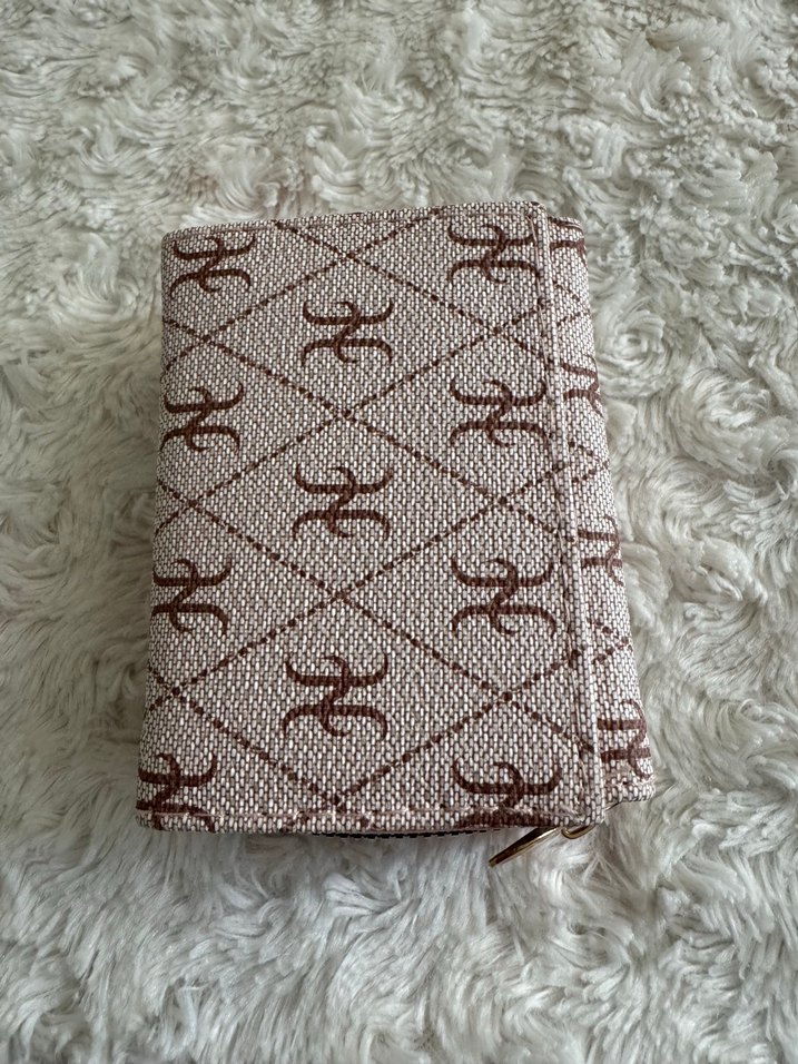 Kahverengi, nakış desenli ve fermuarlı kadın cüzdanı. Sentetik kumaştan yapılmış, günlük kullanıma uygun bohem ve sade bir model.