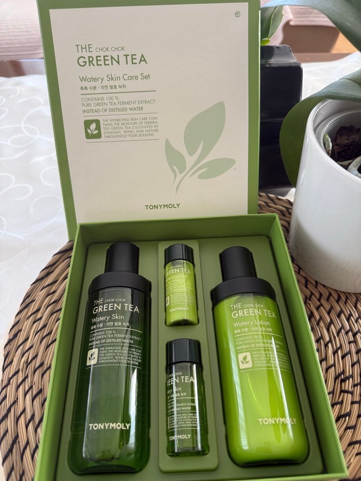 TONYMOLY Yeşil Çay özlü erkek cilt bakım seti, nemlendirme ve yatıştırma için tonik ve losyon içerir.