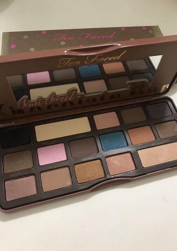 Too Faced göz farı paleti, çeşitli bej ve koyu canlı tonlar içerir, içinde aynası vardır.