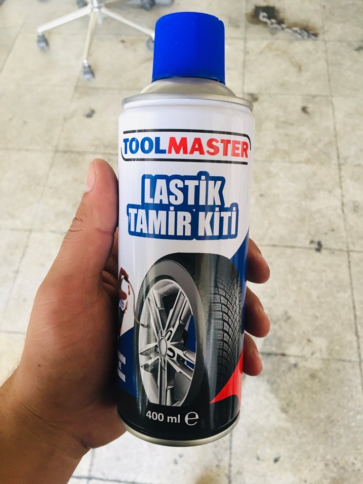 Toolmaster 400ml sprey kutuda lastik tamir kiti, lastik deliklerini hızlıca kapatmak için kullanılır.
