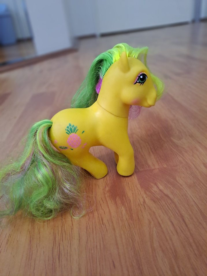 my little pony tropical serisine aittir 1987 yılında üretilmiştir. iki yan tarafında ananas deseni bulunuyor. hiçbir kusuru yoktur koleksiyonluktur. #mylittlewiki #mylittlepony #vintage #unicorn #koleksiyon #barbie #vintageG1 #monsterhigh #everafterhigh #winxclub #winx #bratz