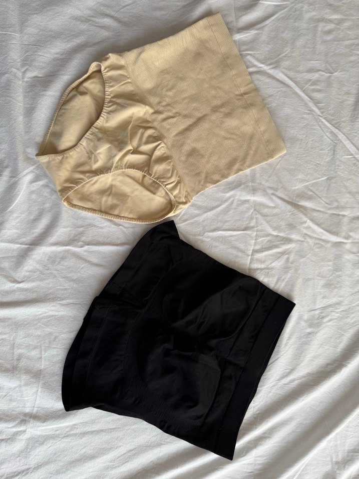 Bej ve siyah renklerde, hamilelik ve emzirme için uygun, kısa ve vücuda oturan düz içlikler.