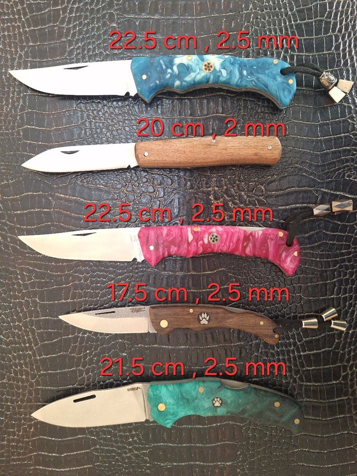 Farklı uzunluklarda (17,5-22,5 cm) ve 2-2,5 mm kalınlığında bıçaklara sahip, turkuaz, mavi, pembe ve ahşap kabze ve full epoksi kabze renkli katlanabilir çakı seti. TOPLAM 5 ADET ÇAKI TAMAMI TOPLU ŞEKİLDE SATILIKTIR TAMANI TEK FİYAT 1.600 TL