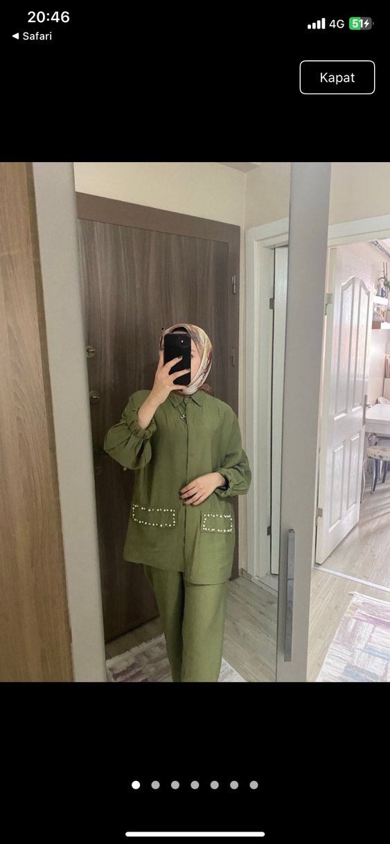 Düğmeli ve uzun kollu haki kadın takımı, normal boy ve regular fit. Minimalist, sade tasarım, sentetik kumaştan üretilmiştir.