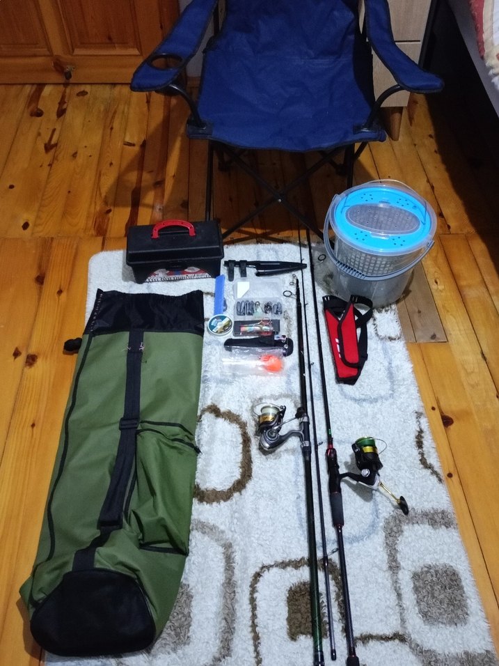 Yeşil taşıma çantası, iki olta ve makara, yem kutusu, takım kutusu ve mavi katlanabilir sandalye içeren balıkçılık seti bütün görünen resimde setler toplu satılık balıkçılığı bırakıyorum uygun fiyat Daiwa Laguna Lt 3000-c spin olta makinesi Kudos Green Face Serisi 270cm Olta Kamışı Daiwa RS 3000 Spin Olta Makinesi Ryuji Luna II 270 Cm 4-35 Gr Spin Olta Kamışı güzel setler balıkçılığa adım atanlara atmış olanlara önerilir gayet iyi bir set bu fiyata zor alırsınız bu temizlikte başka yerden balık işini bırakmaya karar verdimden satılıktır