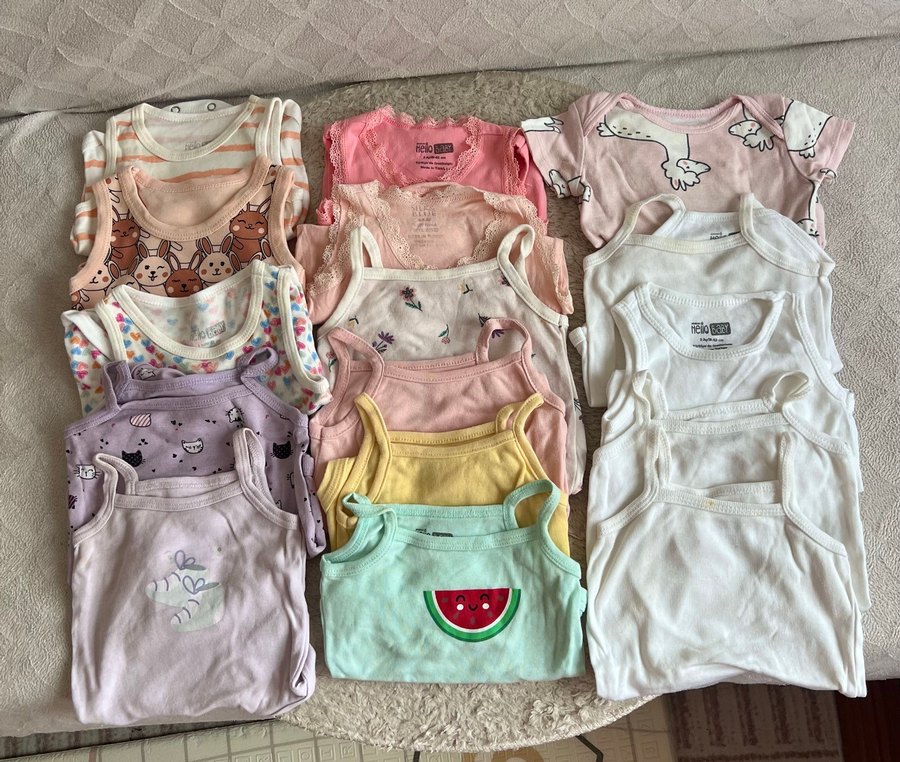 15 adet lcw ve hello baby markalı bebek çıtçıtlı zıbınlar. Toplu olarak satıyorum. 1-2 tanesinde beklemeden kaynaklı minik lekeler var. Çoğu sıfır ayarında görsellere de ekledim yakından zaten. Defoları yok. Çıtçıtları sağlam.
