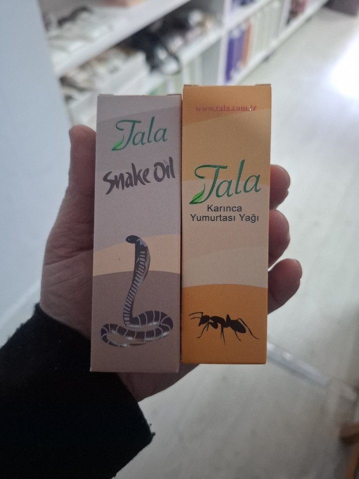 Tala markalı Karınca Yumurtası orYağı ve Yılan Yağı, küçük kutularda sunulan doğal yağlardır.