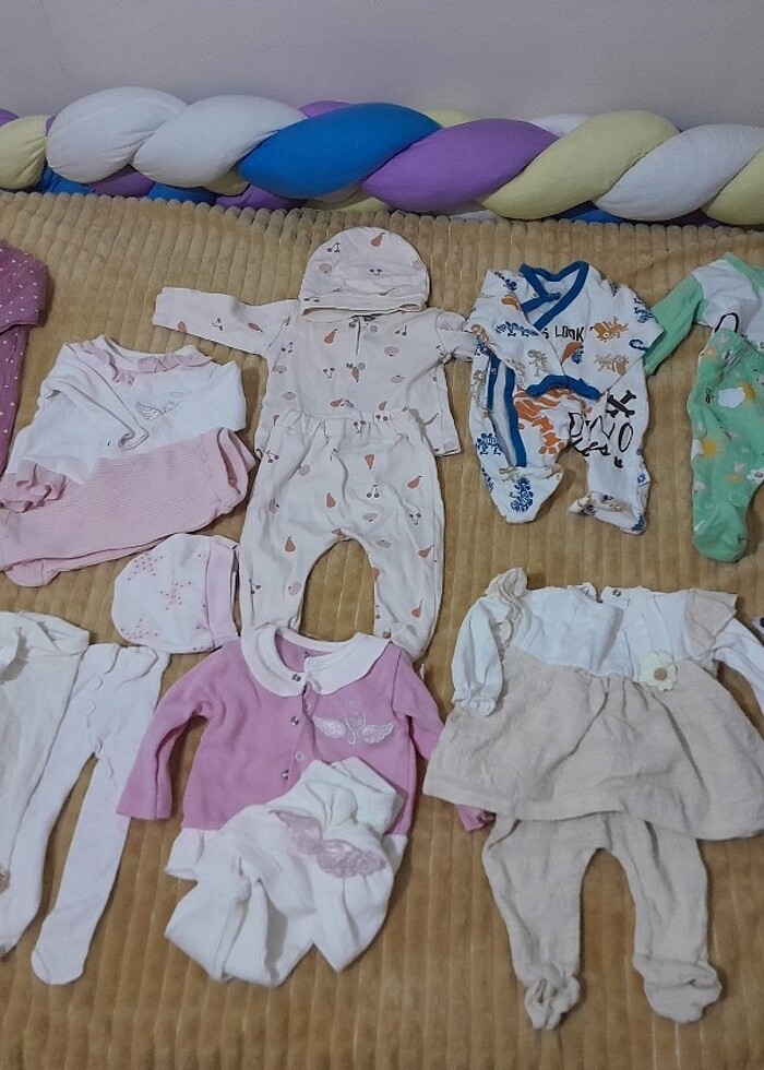 Yenidogan ve 3 aya kadar giyilebilir az giyildi ilave birkaç parça da eklerim toplamda 5 tulum 3 içlik 2 kilotlu çorap 5 adette ikili takim şapkada var pembe ikili takımın birinin arkasinda kanat var ben onu koparmistim geri dikilebilir fotoğrafta var