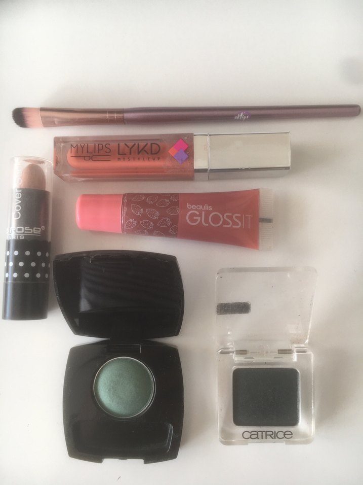 Eklips far fırçası, 1 adet beaulis gloss, 1 adet avon yeşil far, 1 adet gri tonlu simli far, 1 adet lykd likit ruj, iki adet far