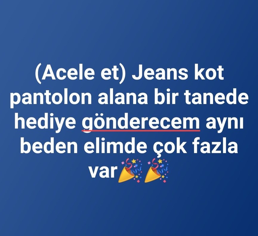 jeans kot pantolon alana bir tanede hediye gönderecem aynı beden elimde çok fazla mevcut hmn kargo yapıyorum iade kabul etmiyorum sorarak alım yapın lütfen