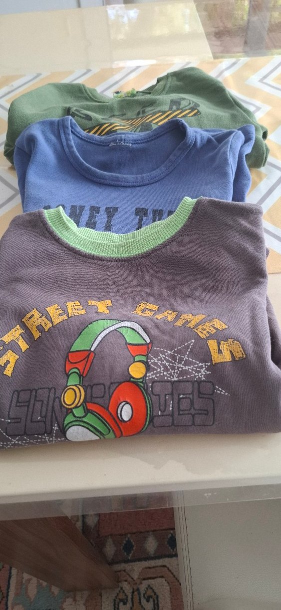 3 tane erkek çocuk uzun kollu sweatshirt 3 4 yaş için uygun.bir tanesinin kolunda küçük bir defo var, fotoda belirttim