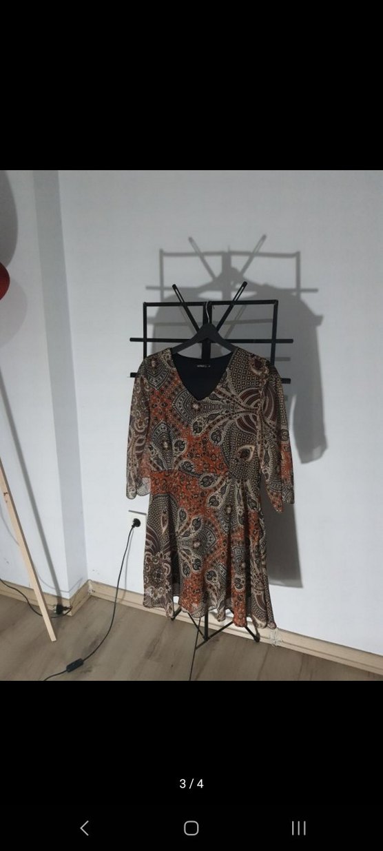 Çoğu 38/40 beden Kahverengi bohem elbise, bağcıklı, dökümlü ve askılı kollu. V-yaka ve koyu desenli, sentetik kumaştan günlük kullanım için uygun.