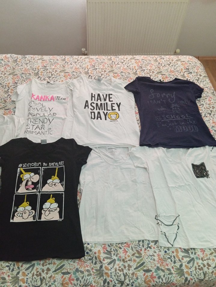 Beyaz renkli, pamuk kumaştan yapılmış, baskılı ve kısa kollu kız tişörtü. Dar kesimi ve yuvarlak yakasıyla rahat bir görünüm sunar. LCW, defacto, sevenhıll markalar çok az kullanıldılar toplu satıs 7 parca