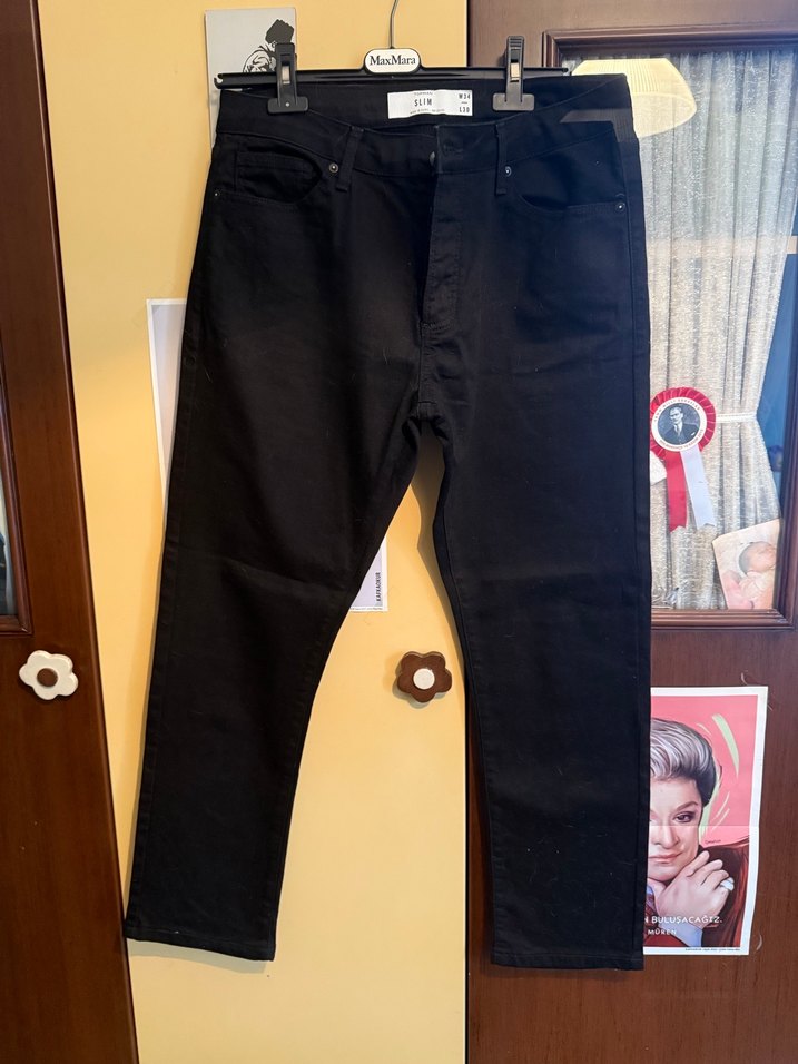 Erkekler için siyah denim kot, normal boy ve regular fit. Tokalı detay içerir, günlük rahat kullanıma uygundur. Topman slim pantolon az kullanıldı yurt dışından alındı 2 adet vardır