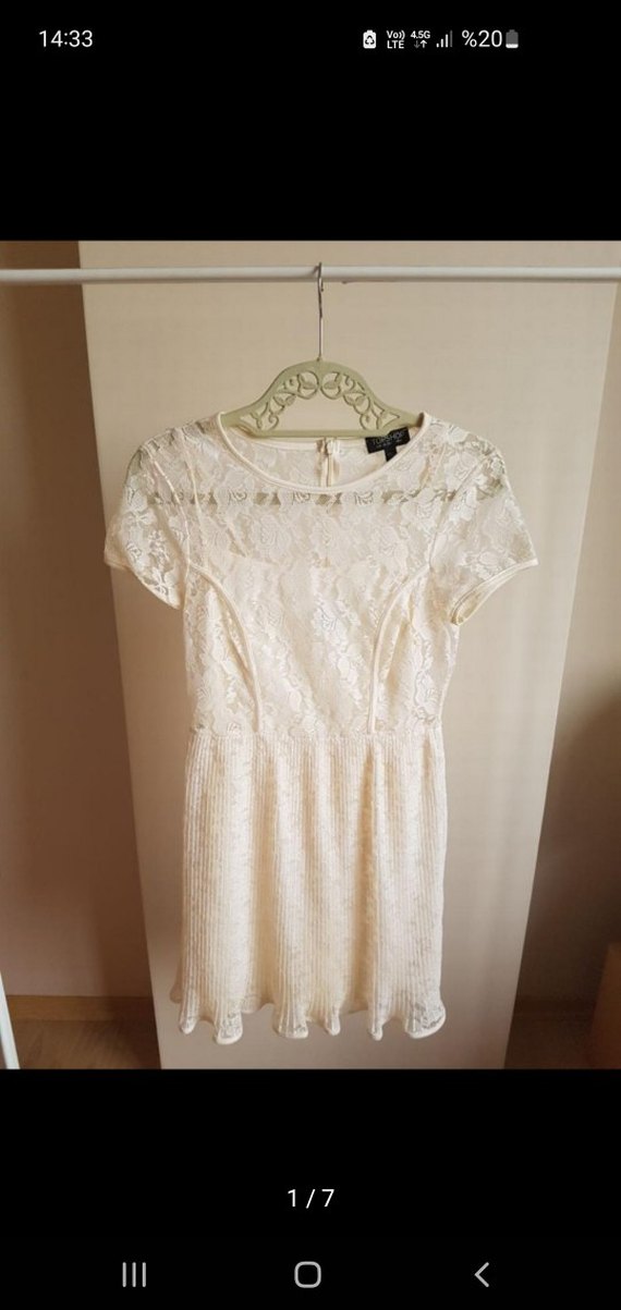 Topshop 34 beden tam kalıp 34 beden. ekru renk yarim kollu etek boyu dizin üzerinde kısa dantelli çok şık romantik elbise. içinde iç astar elbisesi mevcuttur. sadece 1 defa özel günde giyildi. Sıfır ayarında yepyeni durumda.