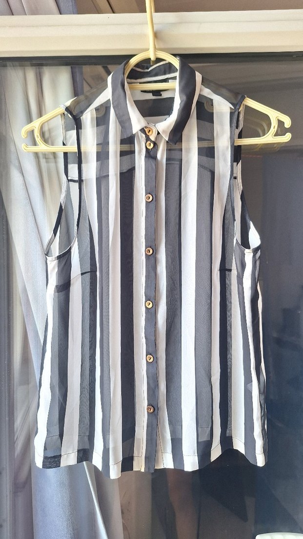 Topshop markalı, düğmeli yakalı, askılı kollu, sentetik kumaştan yapılmış, gri baskılı, günlük sokak modasına uygun kadın gömleği.