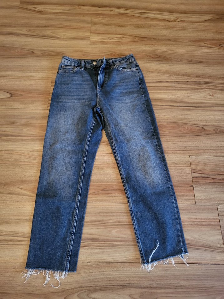 Kadın jean pantolon, normal boy ve midi tarzda, regular fit kesime sahip. Gri-mavi renkte, desen içermeyen denim kumaştan yapılmış, rahat ve şık bir görünüme sahiptir. Günlük kullanıma uygundur.