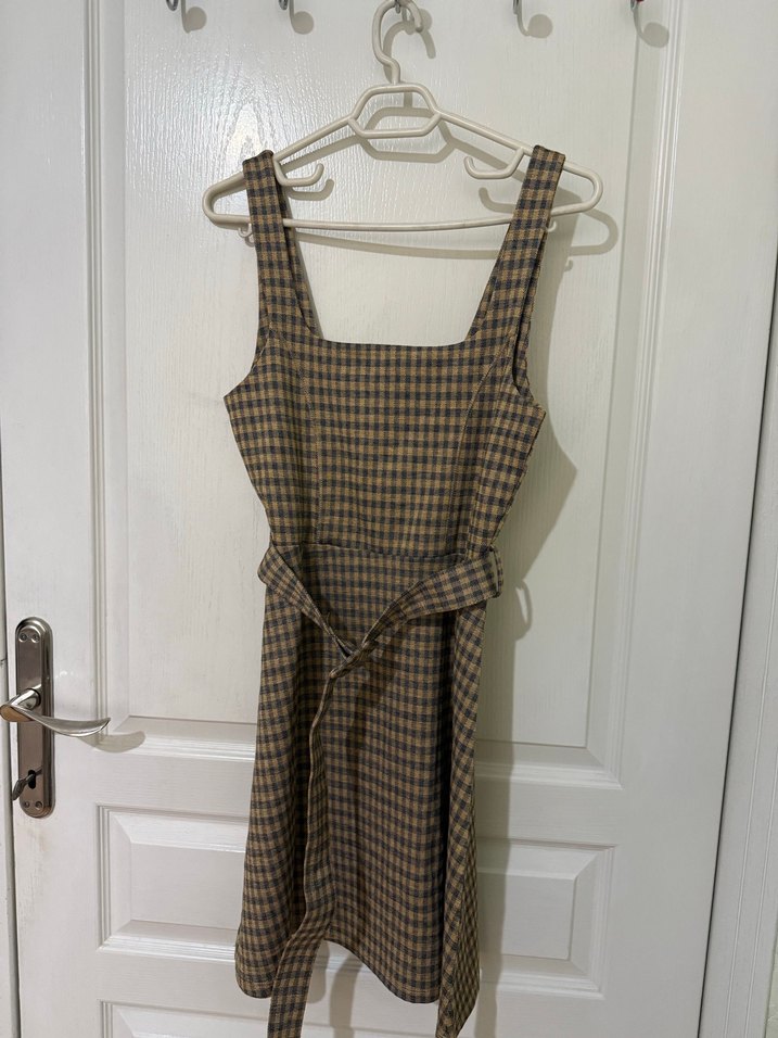 Kahverengi kareli midi elbise, halter yaka ve askılıdır. Belden kemerli olup, sentetik kumaştan yapılmıştır ve günlük sokak stili için uygundur.