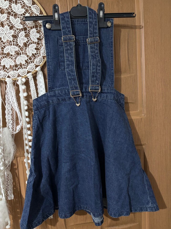 Tokalı ayarlanabilir askılı, askısız yaka, mavi denim kısa salopet.