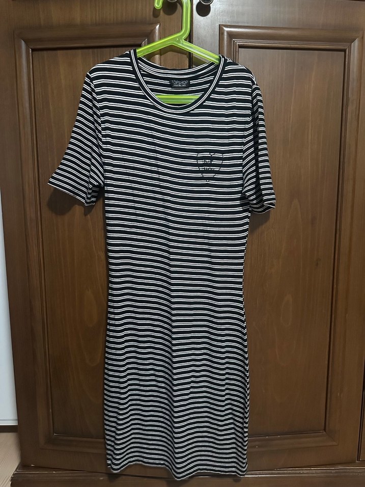 Pamuklu yumuşacık bir dokusu vardır, kısa kollu, bisiklet yaka, siyah ve beyaz çizgili, günlük kullanıma uygun, rahat ve şık midi elbise. bir defa giyildi. bir defosu yoktur.