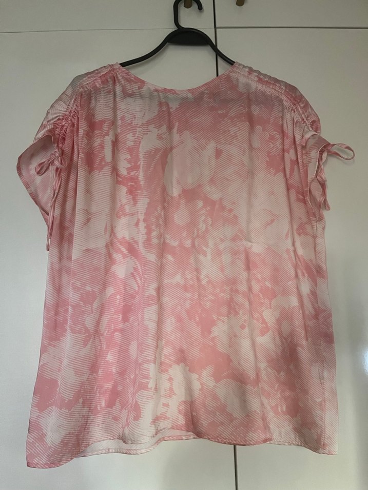 İpek kumaş Pembe pastel tonlarda 42/44 beden uyumlu, tie-dye desenli, drape detaylı ve kısa kollu, kollarında hoş bir bağlama detayı mevcut, yuvarlak yaka, midi uzunlukta, bol kesim kadın bluzu.