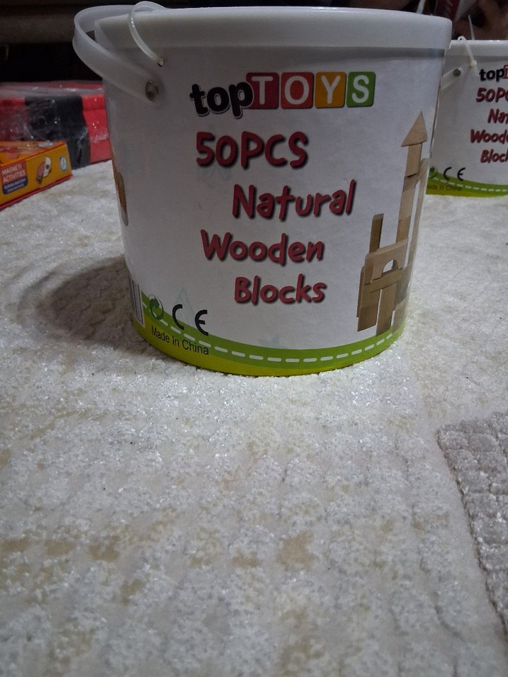 topTOYS markasına ait 50 parça doğal ahşap blok seti, renkli kovada sunulmuştur. Yaratıcı oyun ve inşaat için uygundur.