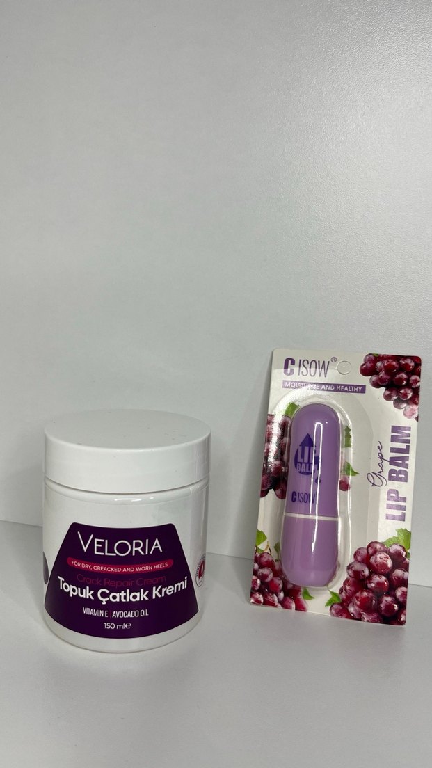 Veloria nemlendirici ve vitamin E ve avokado yağı içeren kuru ve çatlamış topuklar için kremle birlikte sunulur.