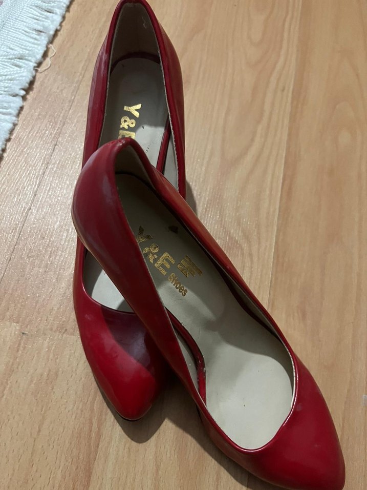 Kırmızı parlak tokalı kadın stiletto, kauçuk malzemeden üretilmiş, klasik ve cesur tarzda, romantik akşamlar için uygun.