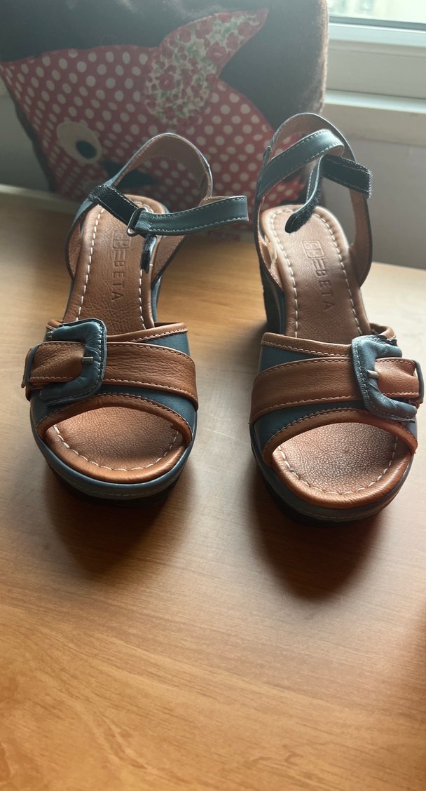 Kahverengi ve gri renklerde, tokalı kayışlı, dolgu topuklu kadın sandalet. Bohem tarzda, günlük kullanım için uygun.