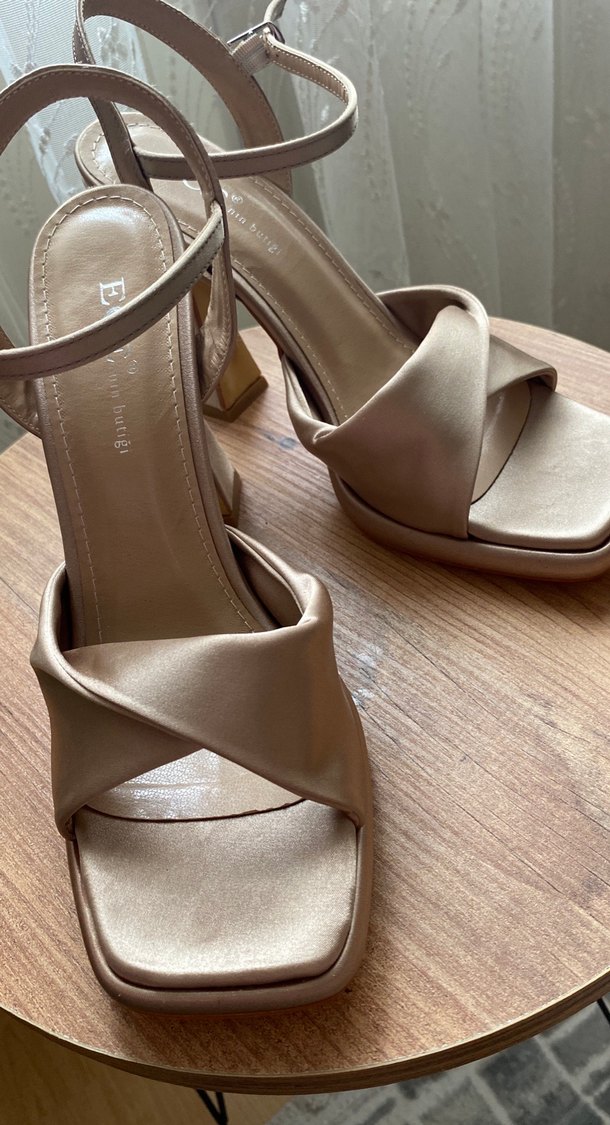 Bej renkli, tokalı platform topuklu kadın akşam ayakkabısı. İpek gibi parlak kumaştan, düğünlere uygun çağdaş ve klasik Paris tarzı. 0 ürün