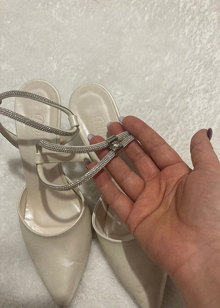 Gelinlikle birlikte giymek için almıştım 5-7 cm çok rahat bir ayakkabı Arkasında ki aşınma dışında bir sorunu yok Rahat olması için 1 beden büyük almıştım ama tam oldu Sedef rengi