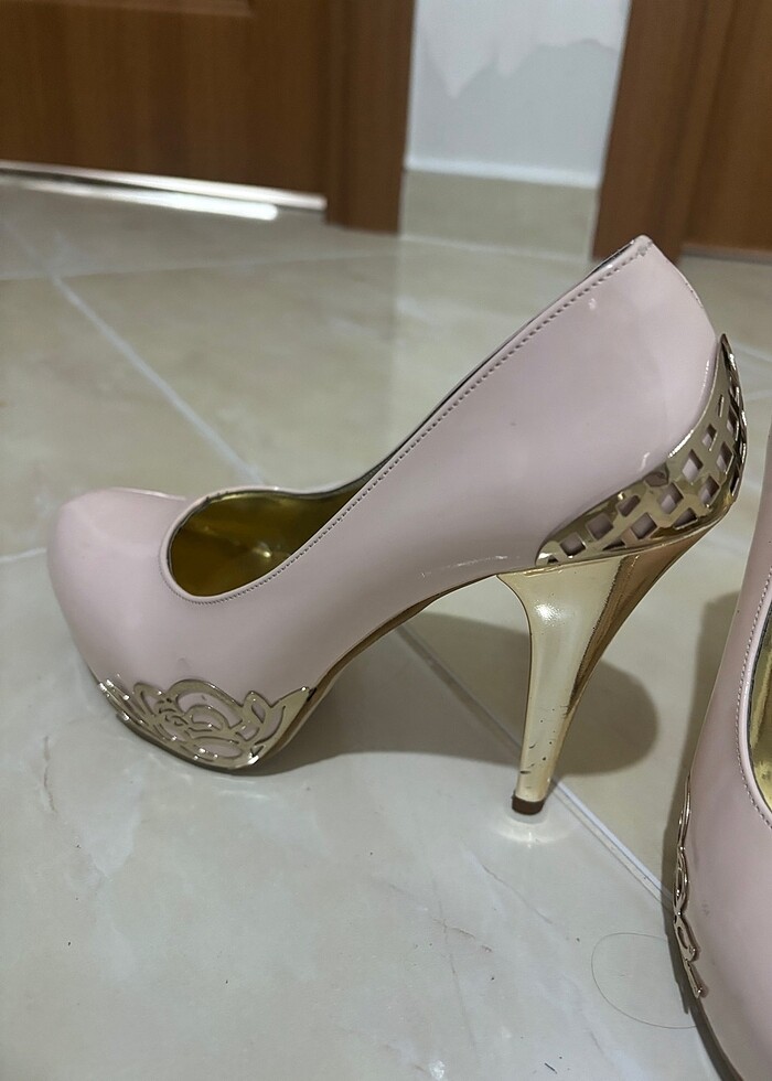 Topuk ve yan tarafında gold detayları var çok az kullanıldı toz pembe rengi topuklu ayakkabı