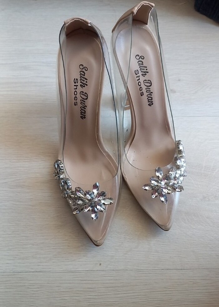 Şeffaf taşlı topuklu ayakkabı sadece nişanimda bir kere giydim , 37 numara , 10 cm topuklu