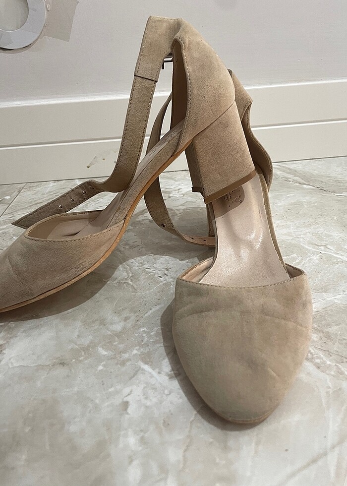 Bantlı krem rengi topuklu ayakkabı. Topuk boyu 4 cm