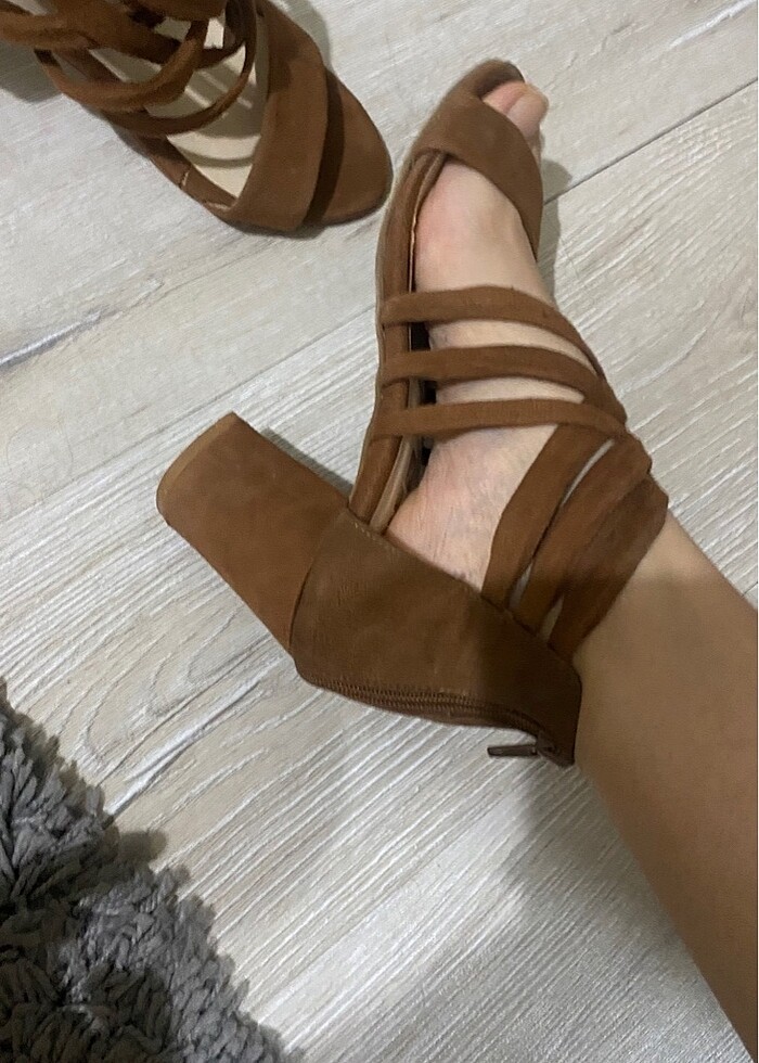 Kahverengi topuklu ayakkabı bi kez giydim iç kısmında küçük bi defosu var fotoğraflarda var ama giyildiğinde gözükmüyor içde kaldığı için